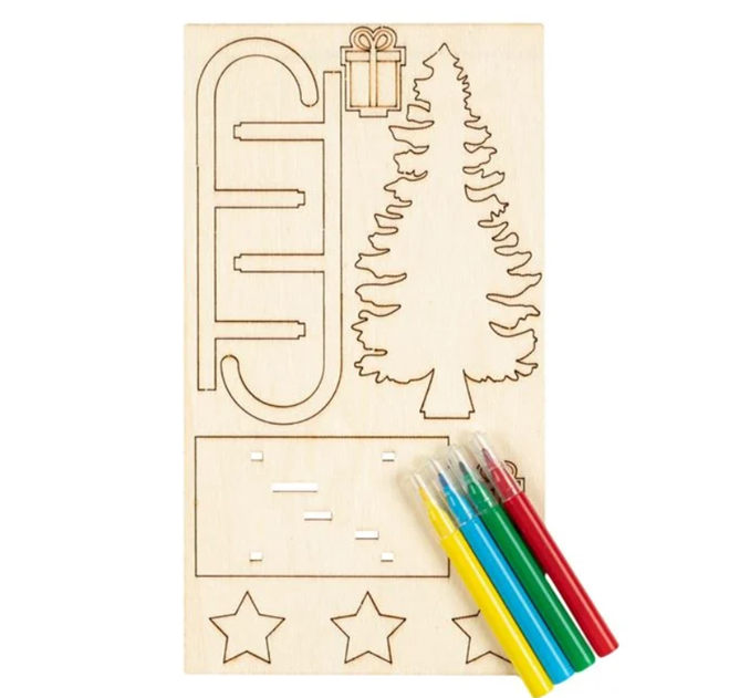 Χριστουγεννιάτικο σετ χειροτεχνίας με ξύλινα διακοσμητικά δέντρο και δώρα για να τοποθετήσετε πάνω στο έλκηθρο. Η συσκευασία περιέχει και 4 mini μαρκαδόρους για να τα ζωγραφίσετε όπως θέλετε.