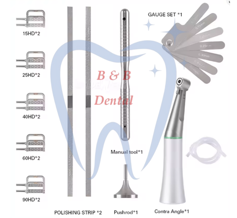Το ΄ΚΙΤ΄ περιλαμβάνει: Χειρολαβή με κούμπωμα 'ISO E type' , Μετρητής διάκενου ανάμεσα στα δόντια ( 0.1mm 0.15mm 0.2mm 0.25mm 0.30mm 0.40mm 0.50mm ), Πριόνια διπλής όψης 2*(15HD, 25HD, 40HD, 60HD, 90HD), Εργαλείο αφαίρεσης πριονιών, 2 μεταλλικές ταινίες λείανσης, Χειροκίνητο εργαλείο για τα πριόνια (ωστέ να έχετε μεγαλύτερη ακρίβεια και χειρισμό.
